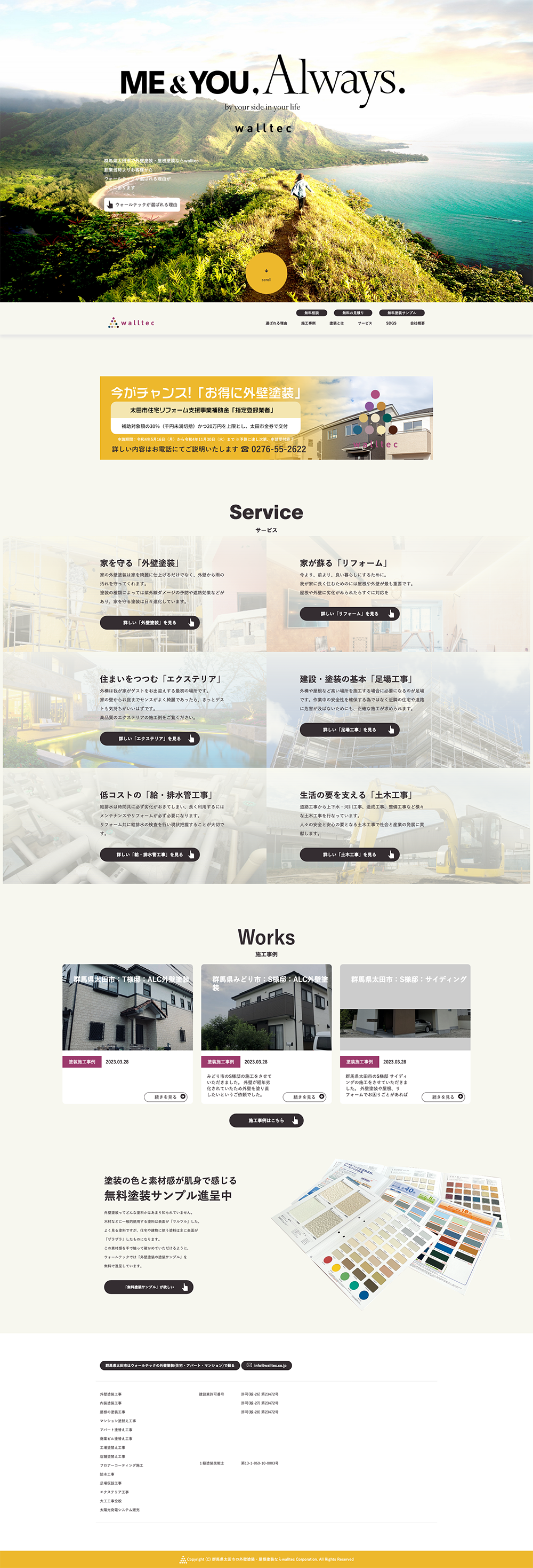 外壁塗装 画面いっぱいの大きなトップページが印象的なウォールテック様のサイト。施工例や、DIYなどの情報もブログのようにアップでき・・・
